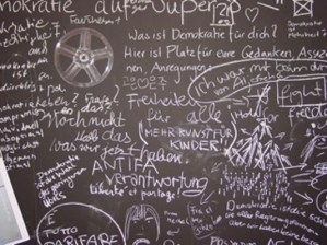 In einem altersgemischten 2-tägigem Workshop untersuchten die Teilnehmer gemeinsam mit den Workshopleiterinnen Margarete Hentze, Christiane Huber und Sanne Kurz, wo sich Demokratie im öffentlichen, halb öffentlichen und privaten Raum zeigt. Es entstanden Storyboards und 2,5 minütige Super8-Filme.